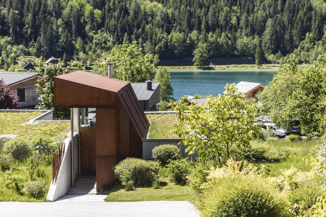 Mit grasbewachsenen Flachdächern fügen sich die Chalets harmonisch in die Landschaft ein, während die Eingangsbereiche aus Cortenstahl markante Akzente setzen. Die rostbraune Oberfläche erinnert an Erdschollen oder Schiffsschornsteine und verleiht den Häusern eine kraftvolle Präsenz. Ideal für Gäste, die Design-Ferienwohnungen am Weißensee in ruhiger Lage suchen.